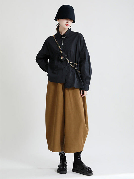 Style Black Elastic Waist Pockets Print Cotton Wide Leg Pants Spring