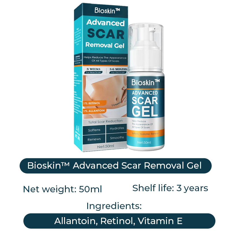 A scar can be flattened, smoothed, or the color removed with Bioskin™ Advanced Scar Removal Gel. The Gel helps flatten the elevated tissue by gradually destroying scar tissue. With this product, the scar's size, redness, hardness, and irritation are all reduced. Leaving no scars on your skin!