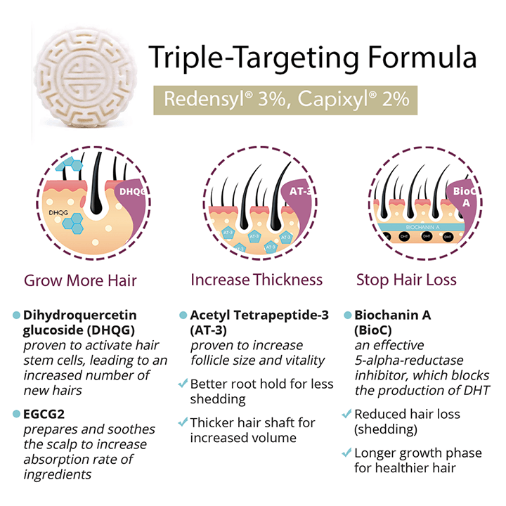 - Combat hair loss, thinning, and shedding from the root by activating hair stem cells
