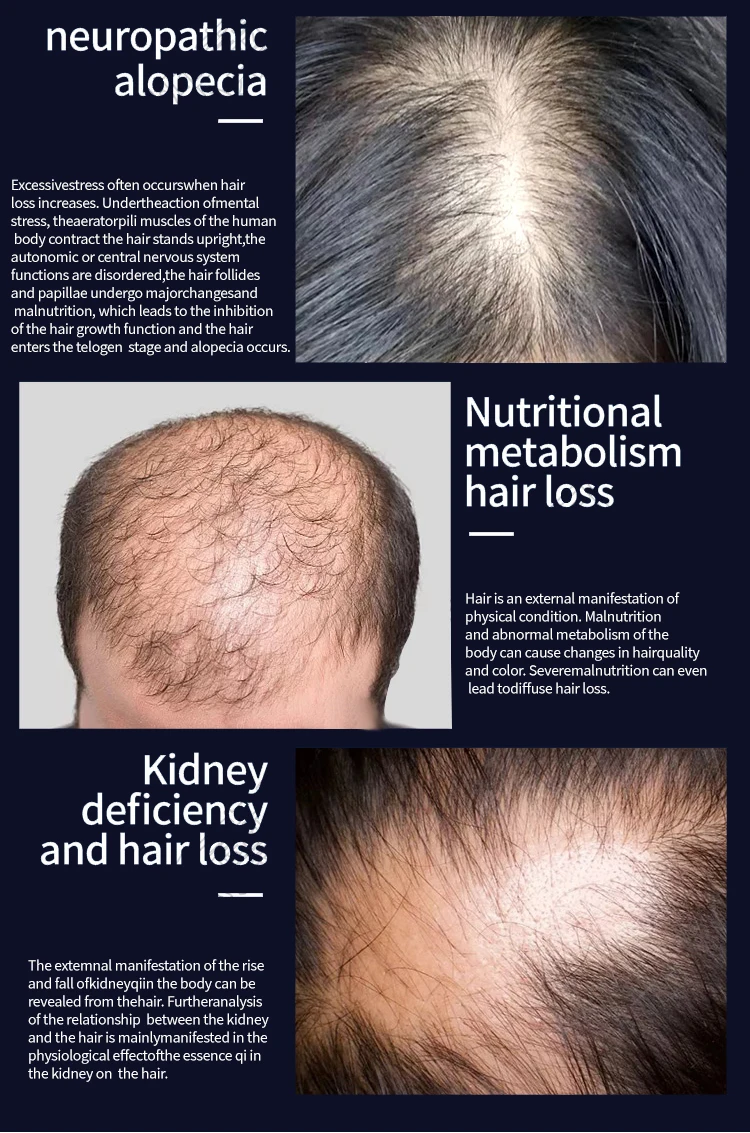 It is suitable for seborrheic alopecia, hairline upward, postpartum hair loss, baldness, hairline widening, stress hair loss, etc.