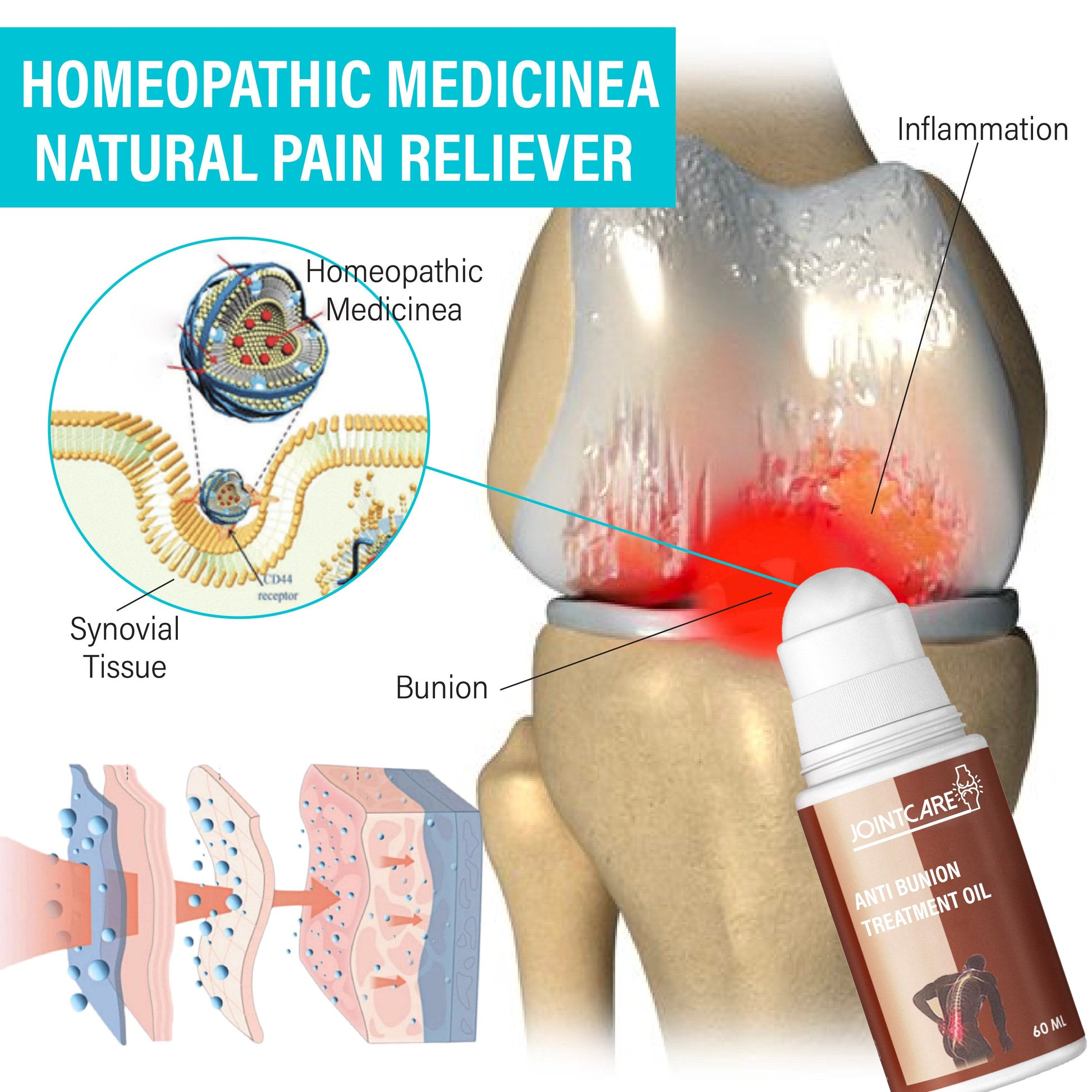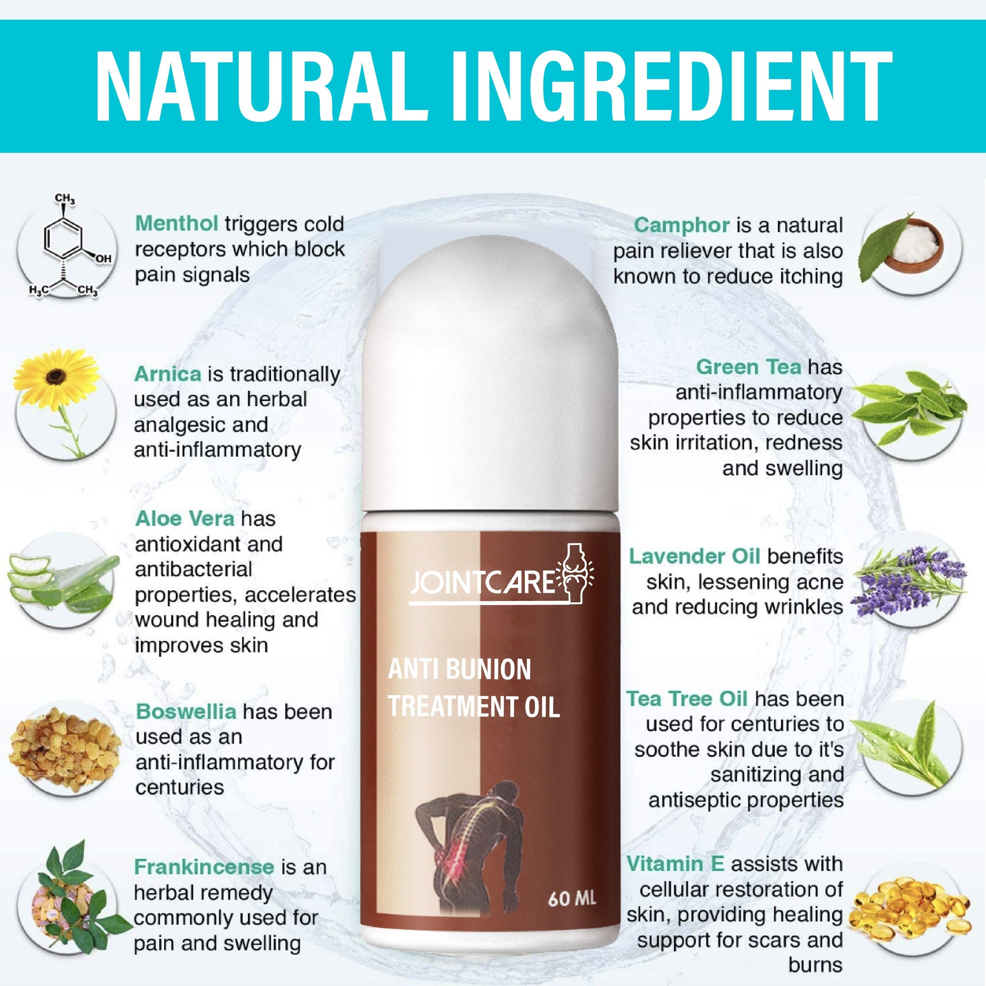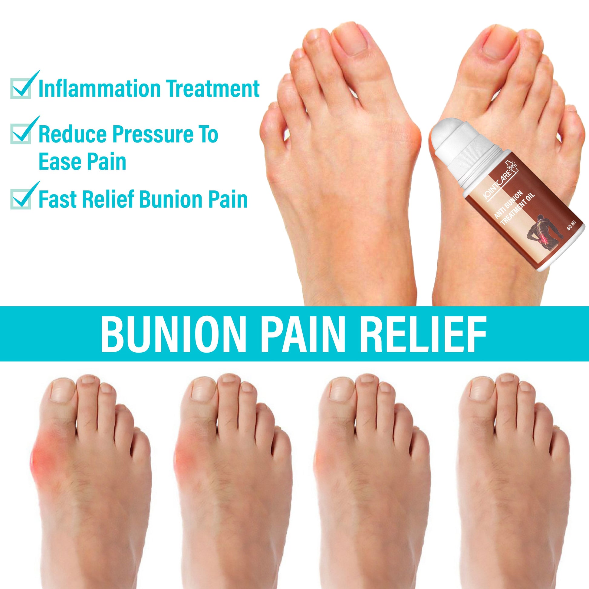 Applying the therapeutic oil to the surface of your toenails provides immediate relief from bunion pain, reducing pain and reducing shoe friction and shoe pressure. Standing for long periods of time can cause severe foot pain when you have bunions or overlapping toes. Use JointCare Anti Bunion Treatment Oil to reduce pain and pain by penetrating and soothing the underlying tissue, with herbal ingredients to help relieve pain.