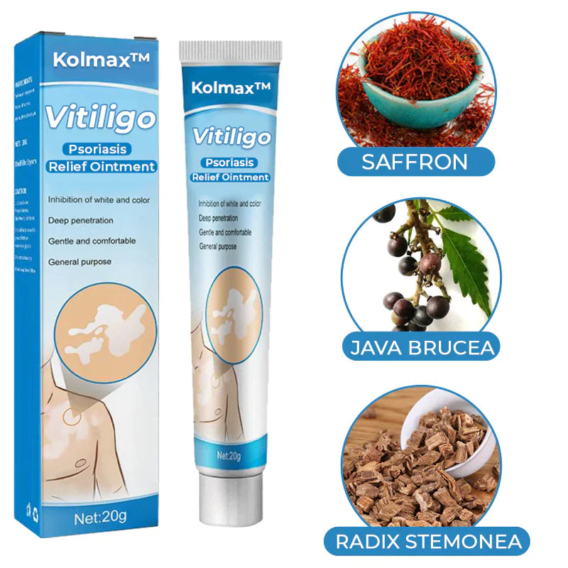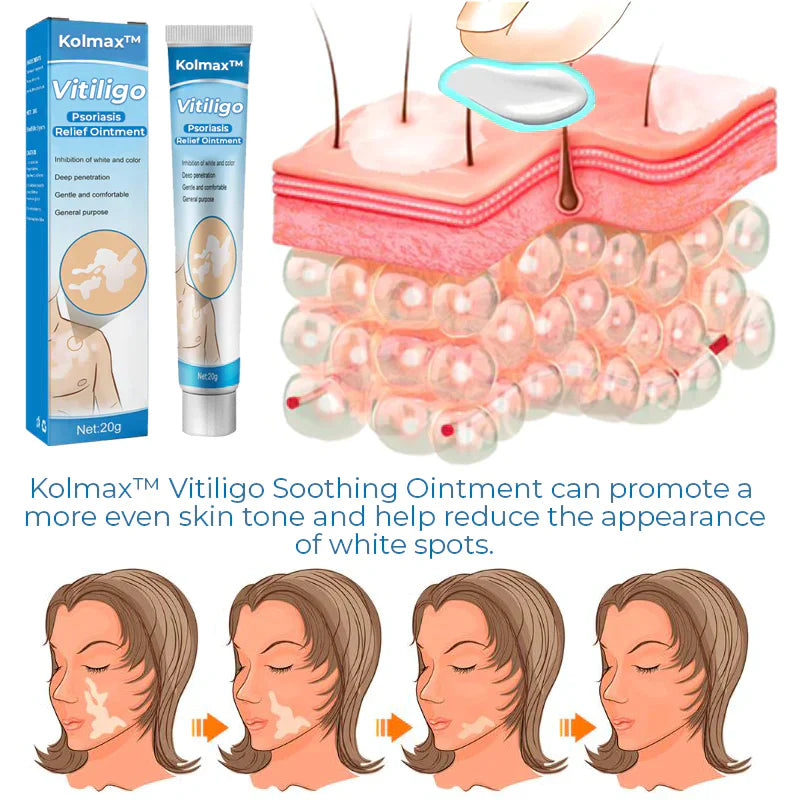 The powerful moisturizing component ofKolmax™ Vitiligo Soothing Ointment penetrates thick regions of skin to offer both immediate and long-lasting relief. effectively cures vitiligo, leukoplakia, skin discoloration, and other skin pigmentation conditions. Hyperpigmented skin problems can occur everywhere on the body.