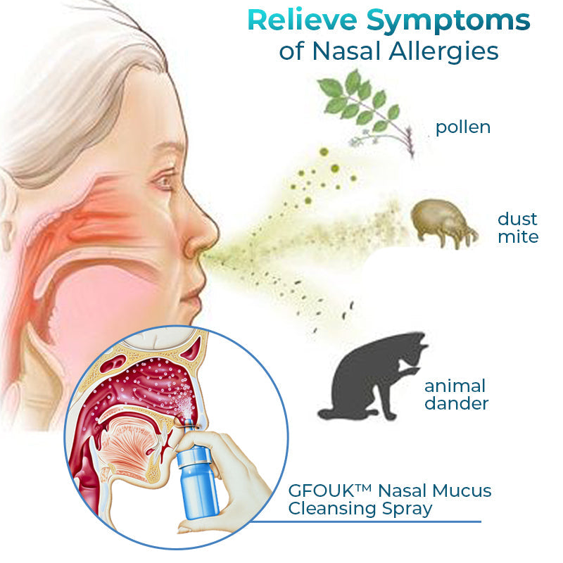 By lowering inflammation and removing irritants from the nasal passages, GFOUK™ Nasal Mucus Cleansing Spray helps to relieve the symptoms of nasal allergies. It also has extra chemicals that can assist to lessen allergy symptoms, such decongestants or antihistamines. Decongestants reduce inflammation and congestion by constricting the blood vessels in the nasal passages. Antihistamines reduce inflammation and other allergy symptoms by preventing the production of histamine.