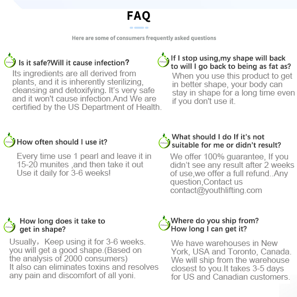 The endocrine system and the urinary system are very important detoxification pathways for the human body.That is why we created Yoni Detoxing Pearls - it contains ginger and L-Arginine with more than ten kinds of plant-derived ingredients, which are packed with natural properties that aids in reducing inflammation and eliminating toxins, help break down fat cells, reduce body weight and boost metabolism.