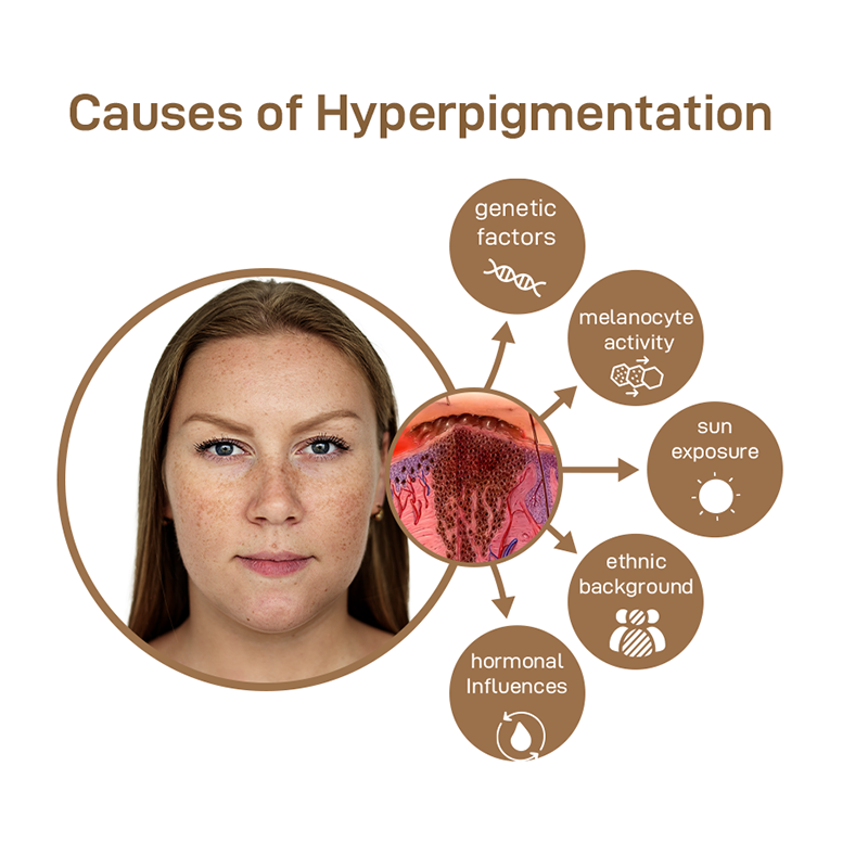 Hyperpigmentation is a common skin condition characterized by the darkening or increased pigmentation of certain areas of the skin compared to the surrounding skin. It occurs when there is an overproduction or accumulation of melanin, the pigment responsible for the color of our skin, hair, and eyes. Melanin is produced by melanocytes, specialized cells in the skin.