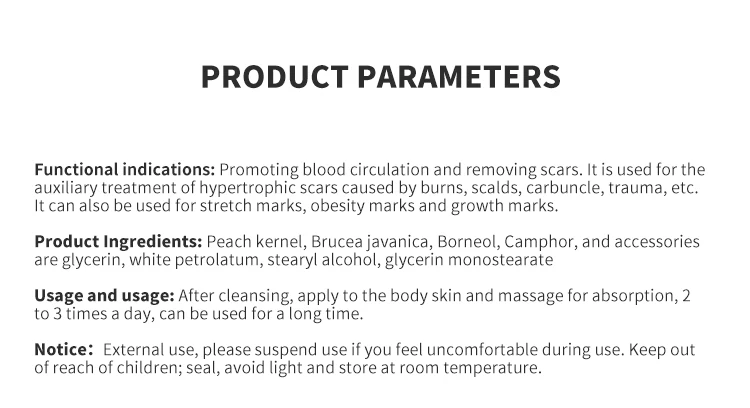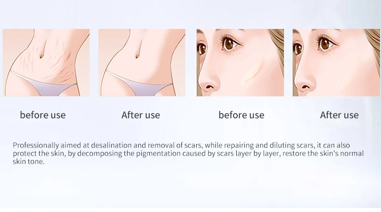 Promoting blood circulation and removing scars. It is used for the auxiliary treatment of hypertrophic scars caused by burns, scalds, carbuncle, trauma, etc.It can also be used for stretch marks, obesity marks and growth marks.