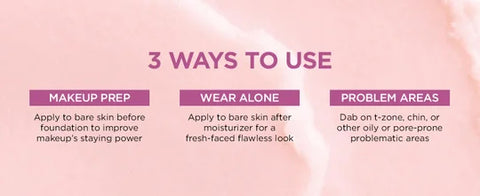 MAKEUP PRIMER FOR FACE AND UNDEREYE: Apply on bare skin or after moisturizer has absorbed completely. Blend into under eye to smooth over fine lines, nose and cheeks to minimize appearance of pores and blemishes, t zone for a matte result