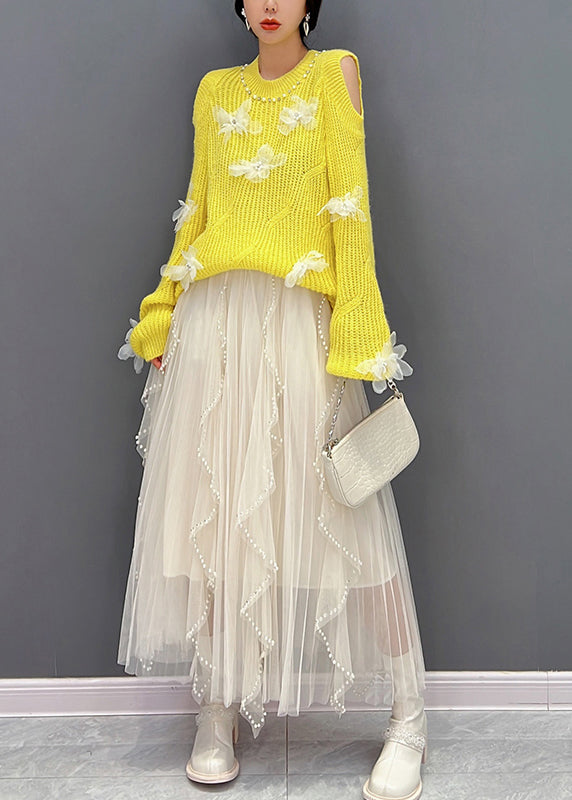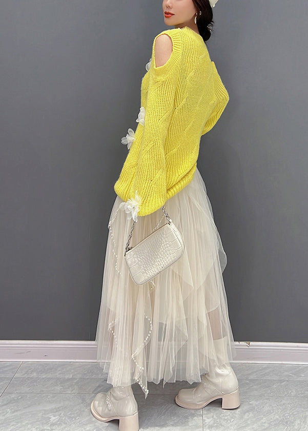 Yellow O-Neck Knit Top And Tulle Maxi Skirts Two Pieces Set Fall